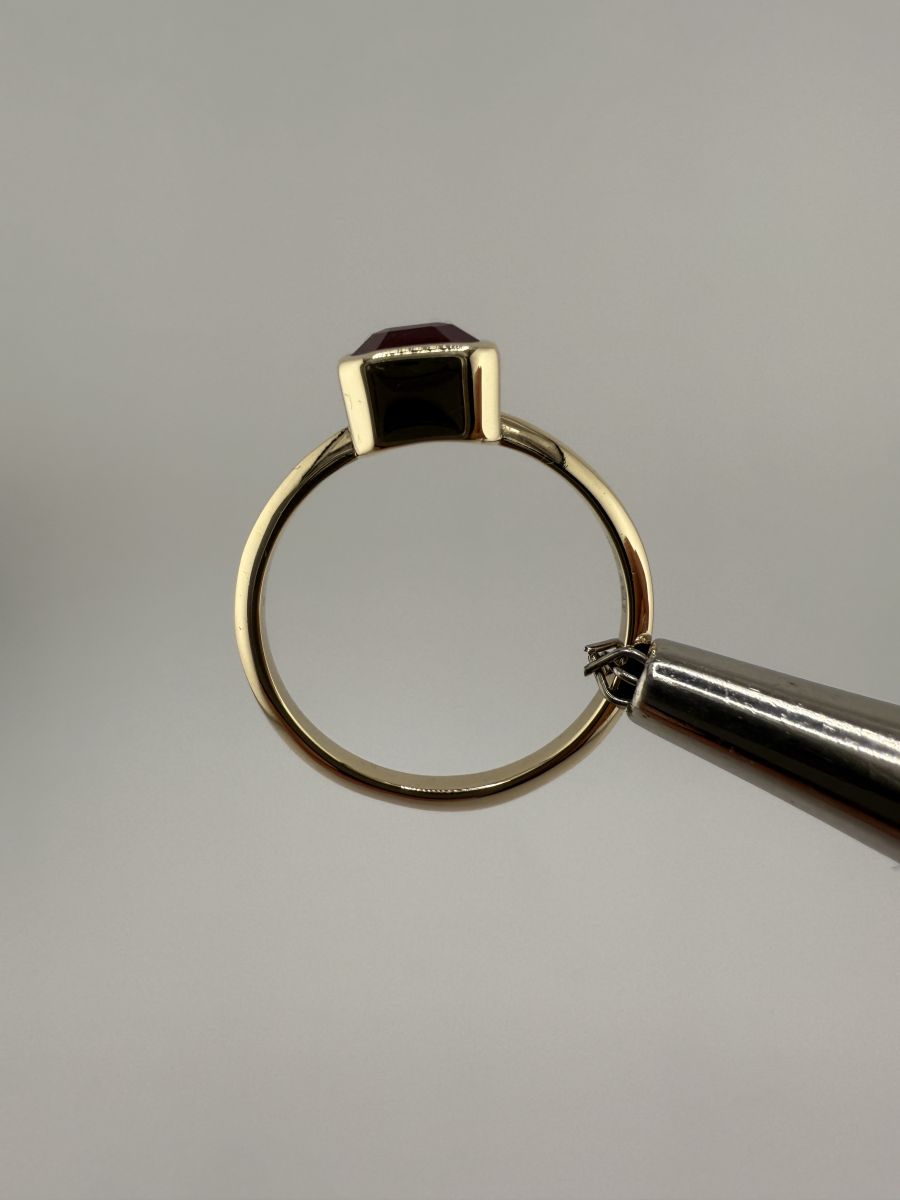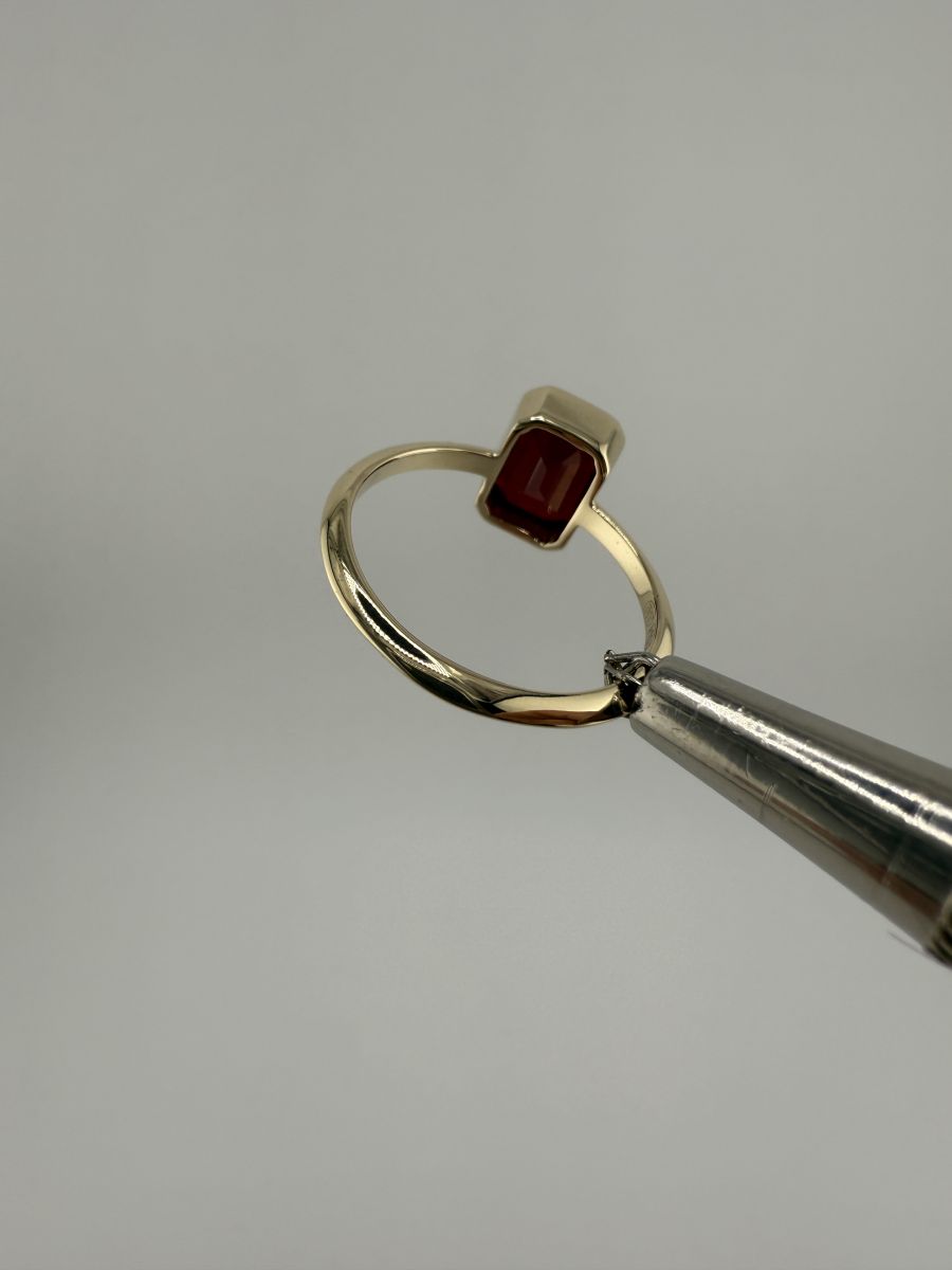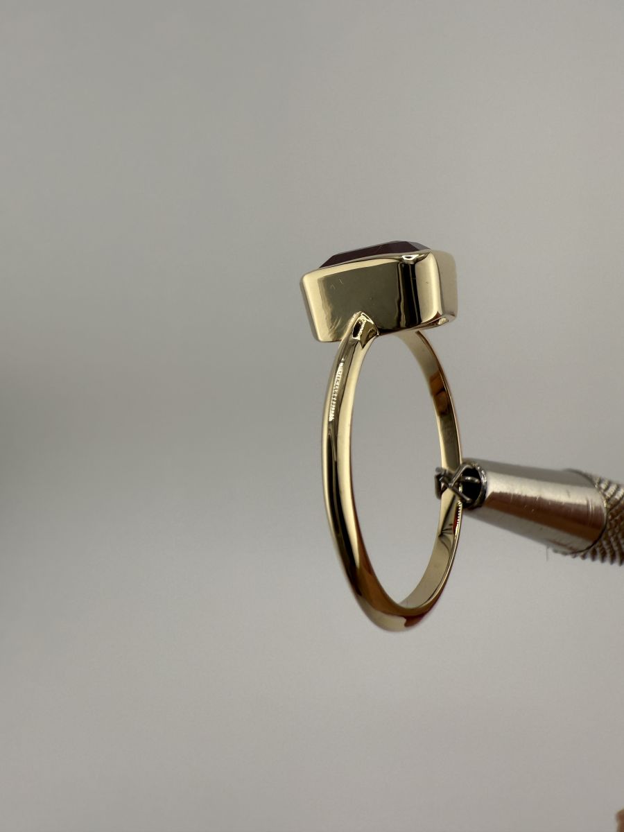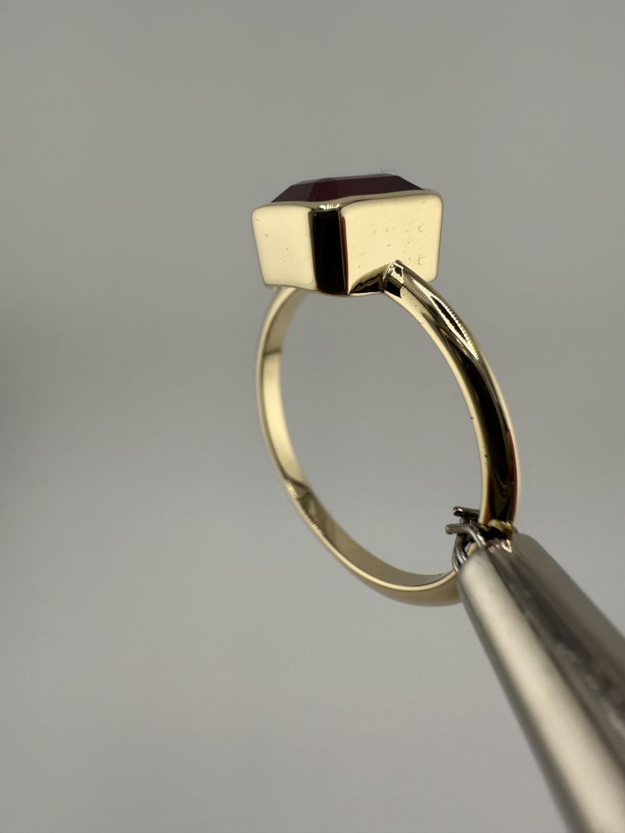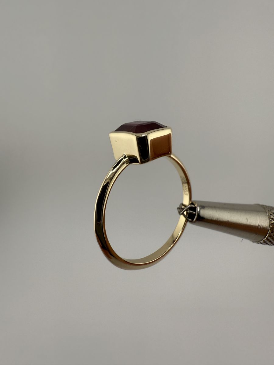 Pierścionek Elegance Horizon to połączenie ponadczasowej elegancji i nowoczesnego designu. Wykonany z żółtego złota, centralny kamień w kształcie ośmiokąta, ze ściętymi rogami, został osadzony poprzecznie w stosunku do dłoni, co nadaje pierścionkowi wyjątkowy, geometryczny wygląd. Ten niezwykle stylowy pierścionek przyciąga uwagę swoim wyrafinowanym blaskiem i doskonałym wykończeniem, podkreślając indywidualność i elegancję noszącej go osoby.