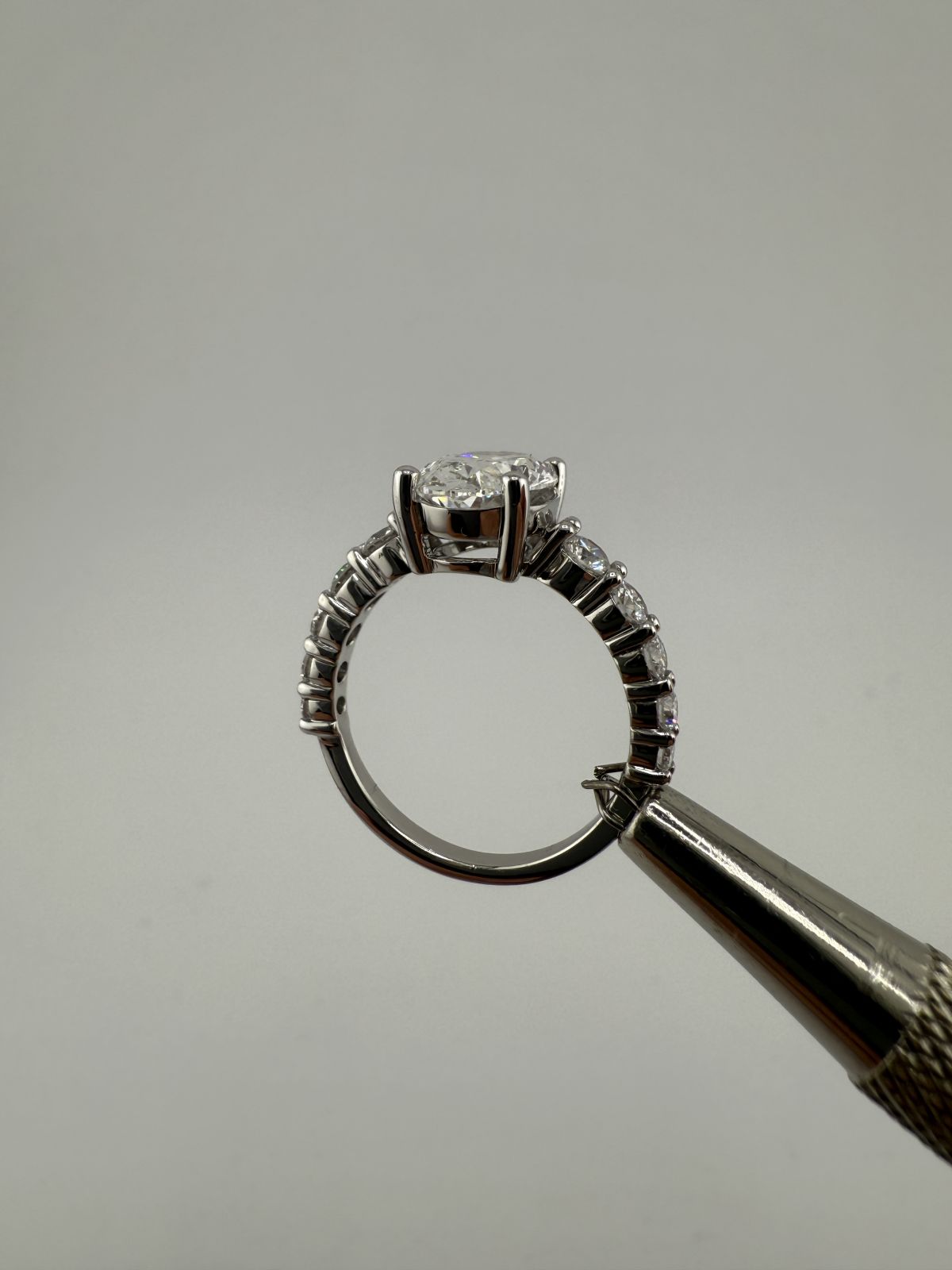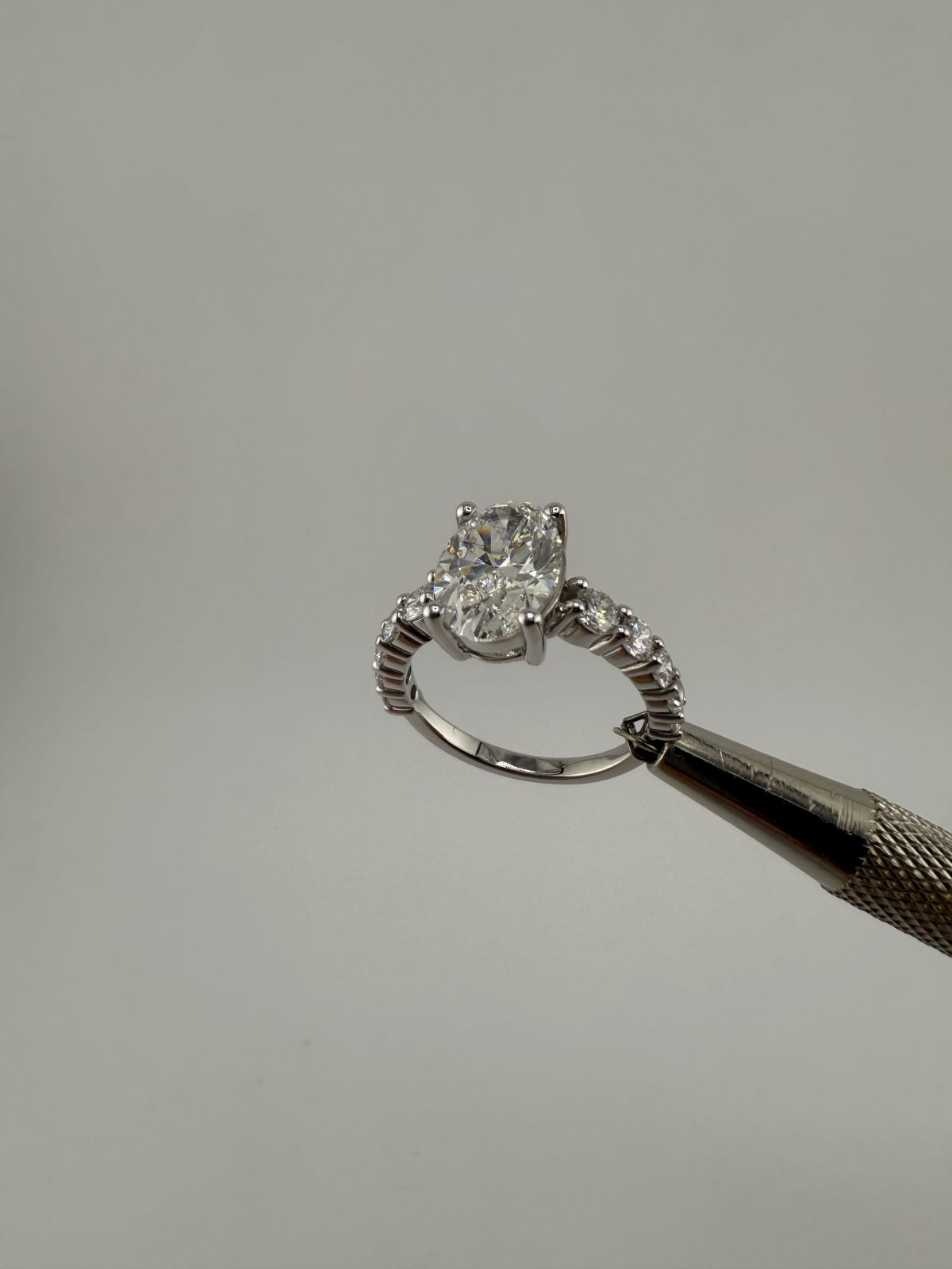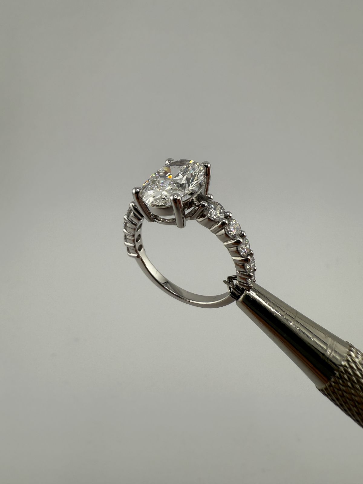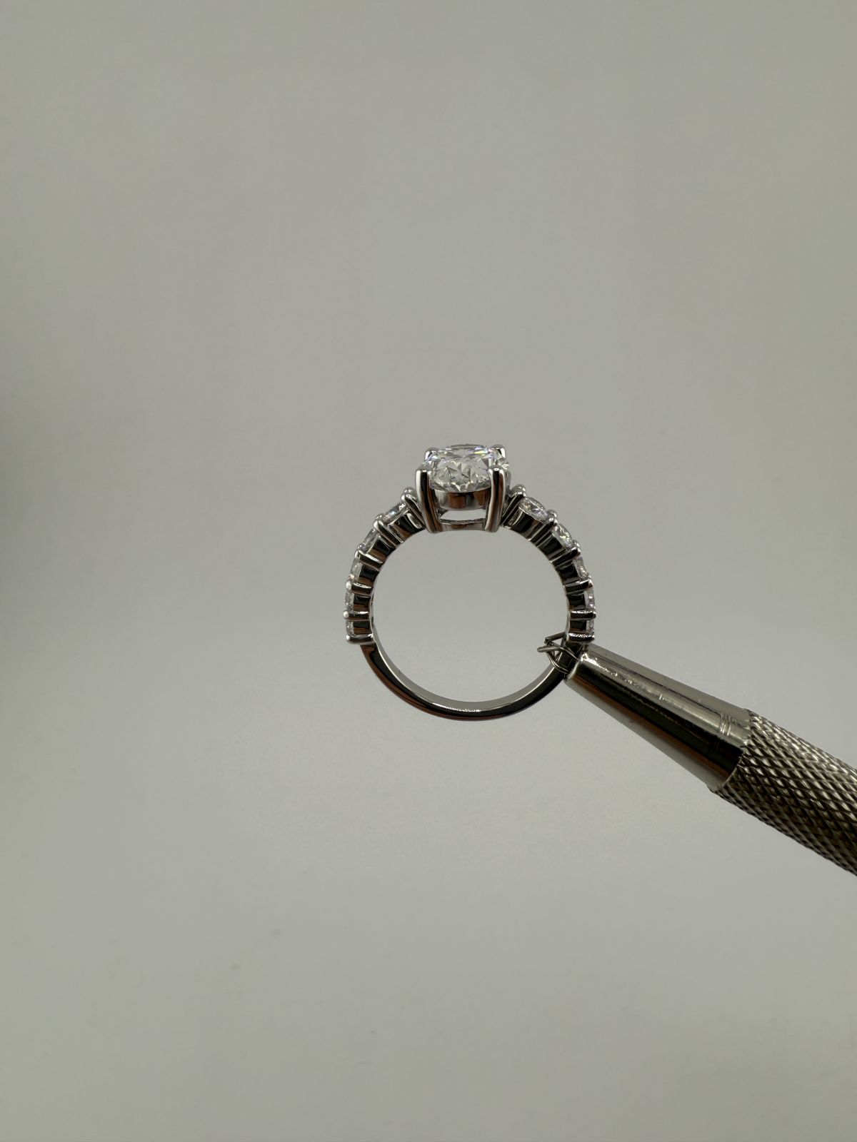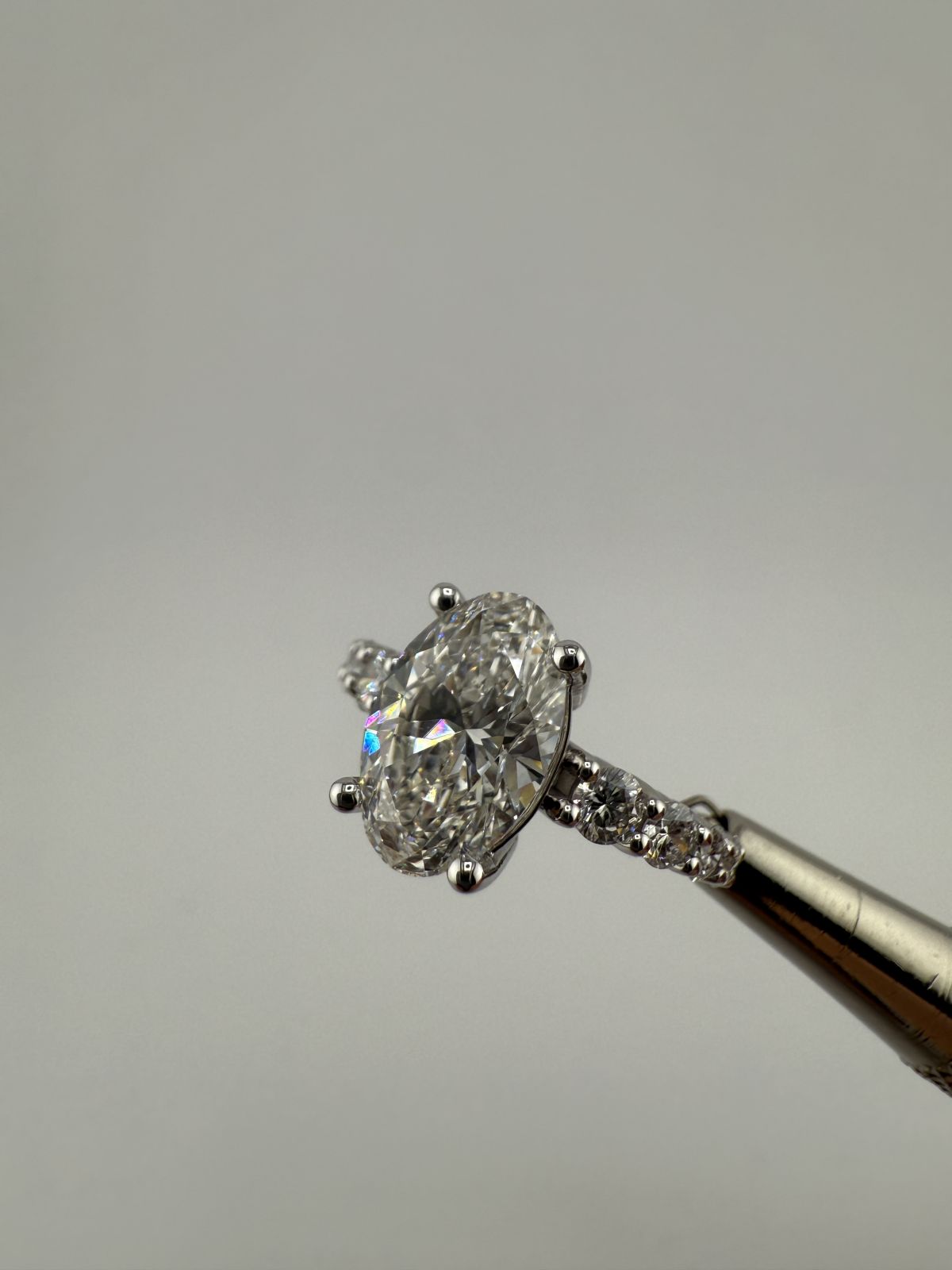 Grand Oval Pave to pierścionek z owalnym kamieniem centralnym, który podkreślają okrągłe kamienie ułożone po obu stronach szyny. Boczna gradacja kamieni od 3,0 mm przy kamieniu do 2,1 mm w najdalszym punkcie tworzy harmonijną linię i intensywny blask (łącznie 10 sztuk). Smukła, pave’owa oprawa elegancko wydłuża owal i nadaje całości nowoczesny, szlachetny charakter.