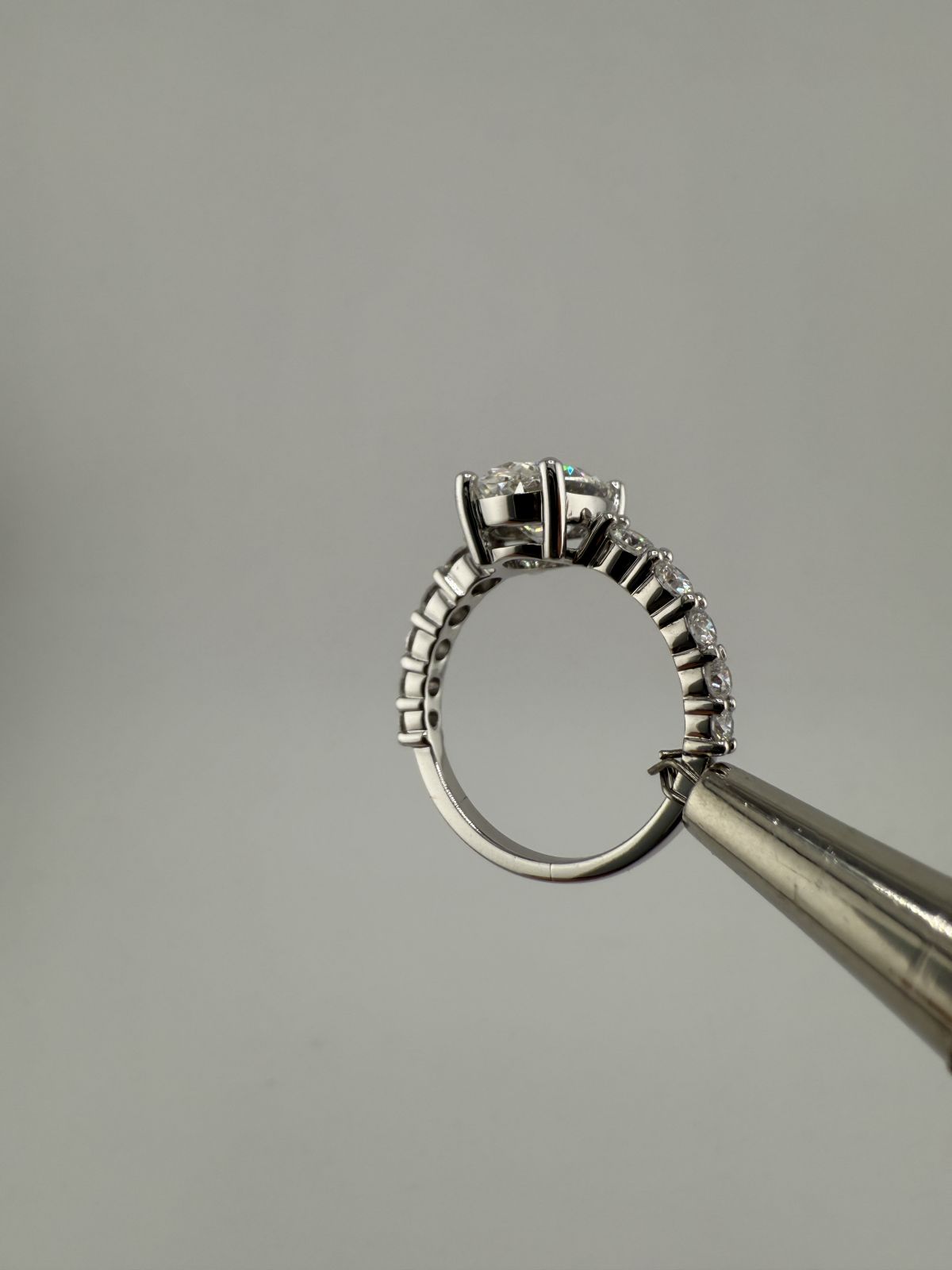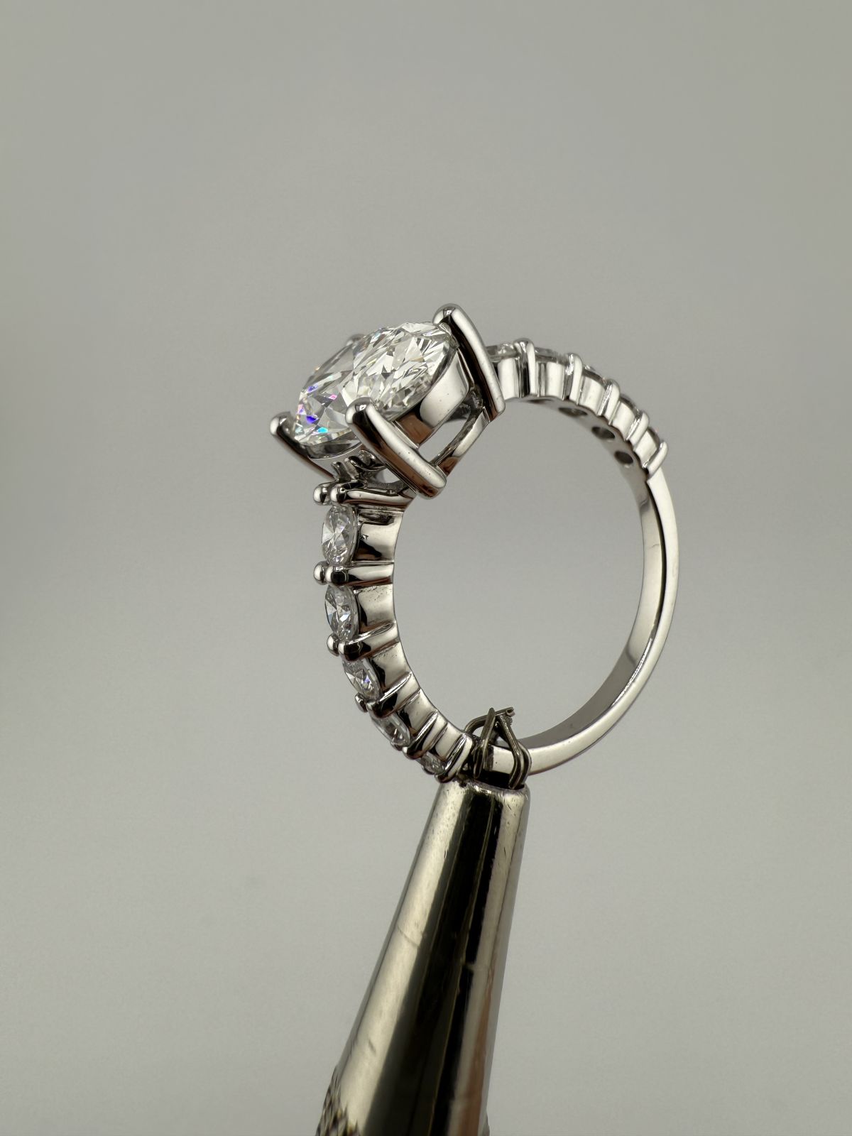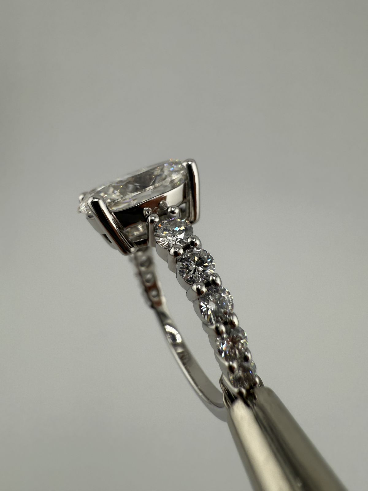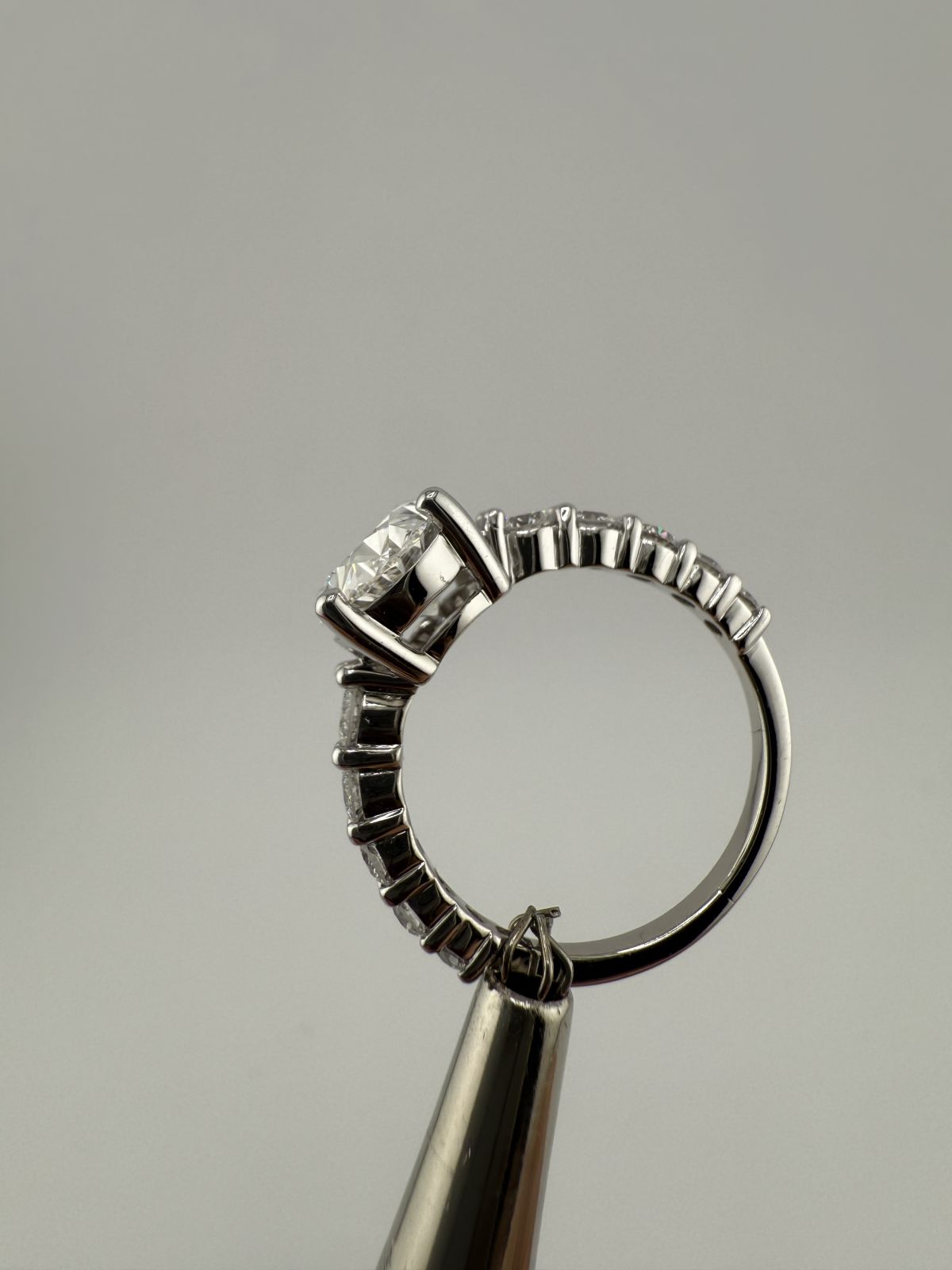 Grand Oval Pave to pierścionek z owalnym kamieniem centralnym, który podkreślają okrągłe kamienie ułożone po obu stronach szyny. Boczna gradacja kamieni od 3,0 mm przy kamieniu do 2,1 mm w najdalszym punkcie tworzy harmonijną linię i intensywny blask (łącznie 10 sztuk). Smukła, pave’owa oprawa elegancko wydłuża owal i nadaje całości nowoczesny, szlachetny charakter.