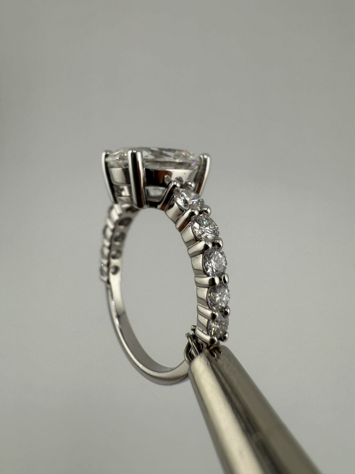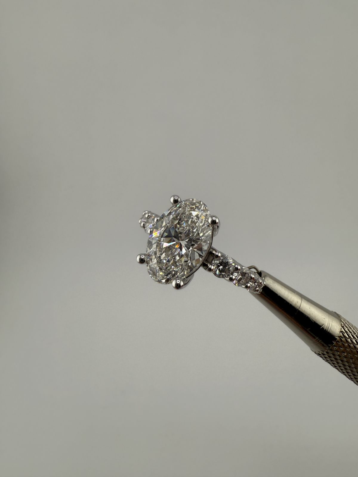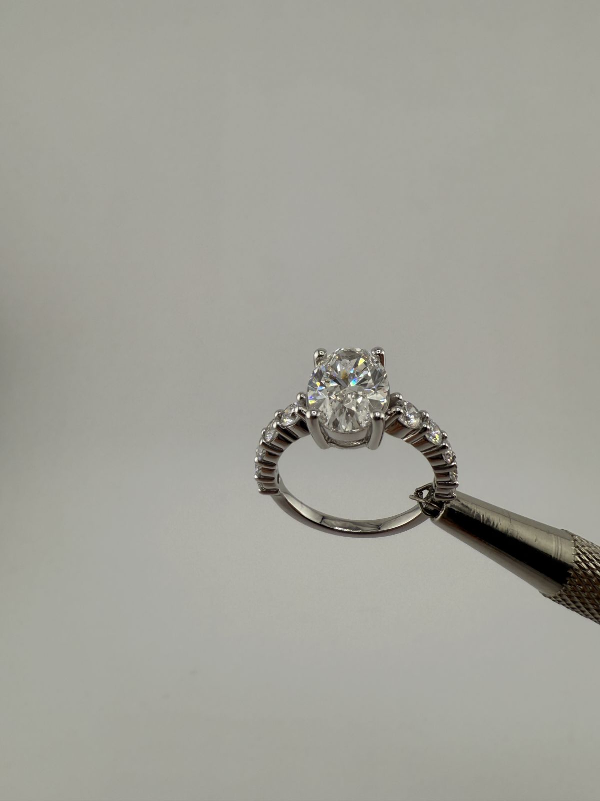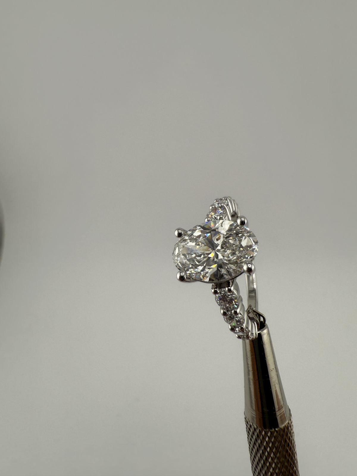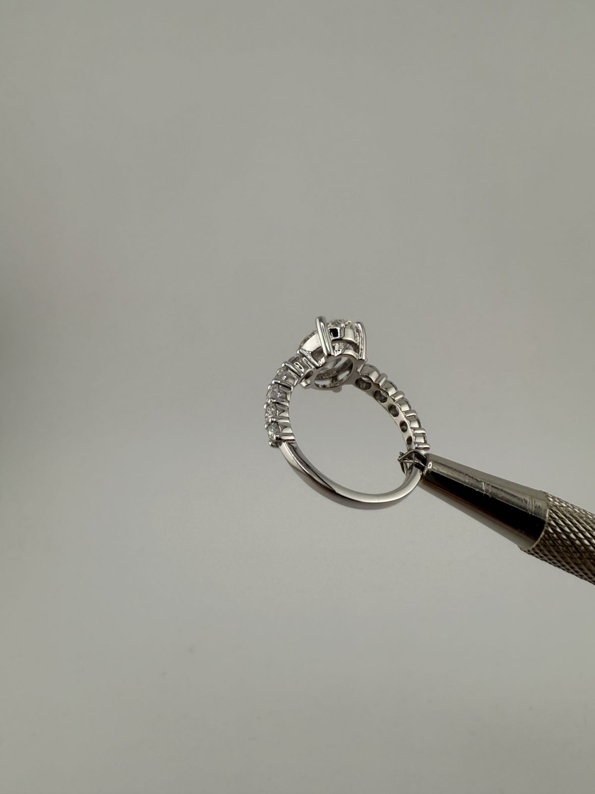 Grand Oval Pave to pierścionek z owalnym kamieniem centralnym, który podkreślają okrągłe kamienie ułożone po obu stronach szyny. Boczna gradacja kamieni od 3,0 mm przy kamieniu do 2,1 mm w najdalszym punkcie tworzy harmonijną linię i intensywny blask (łącznie 10 sztuk). Smukła, pave’owa oprawa elegancko wydłuża owal i nadaje całości nowoczesny, szlachetny charakter.