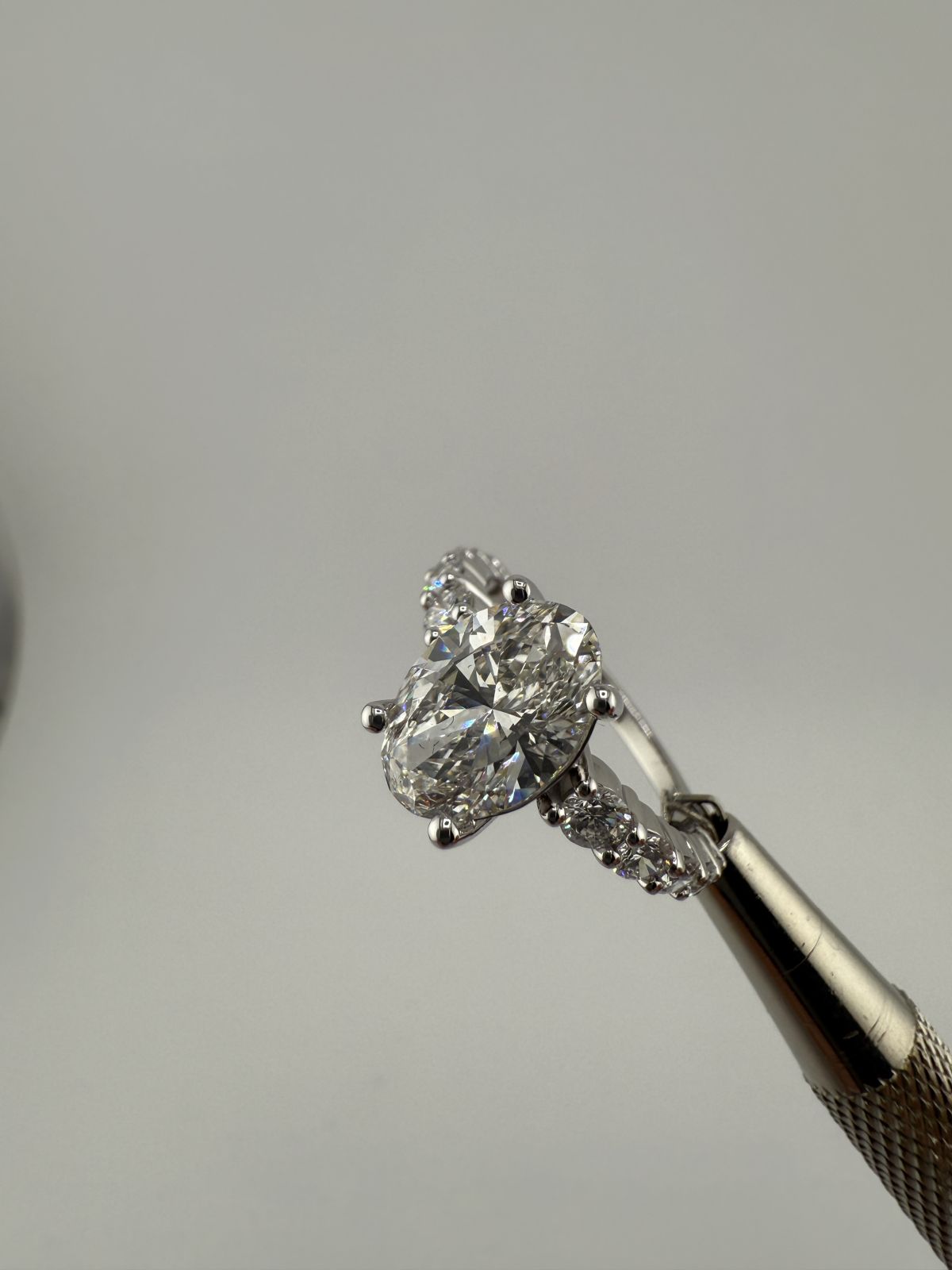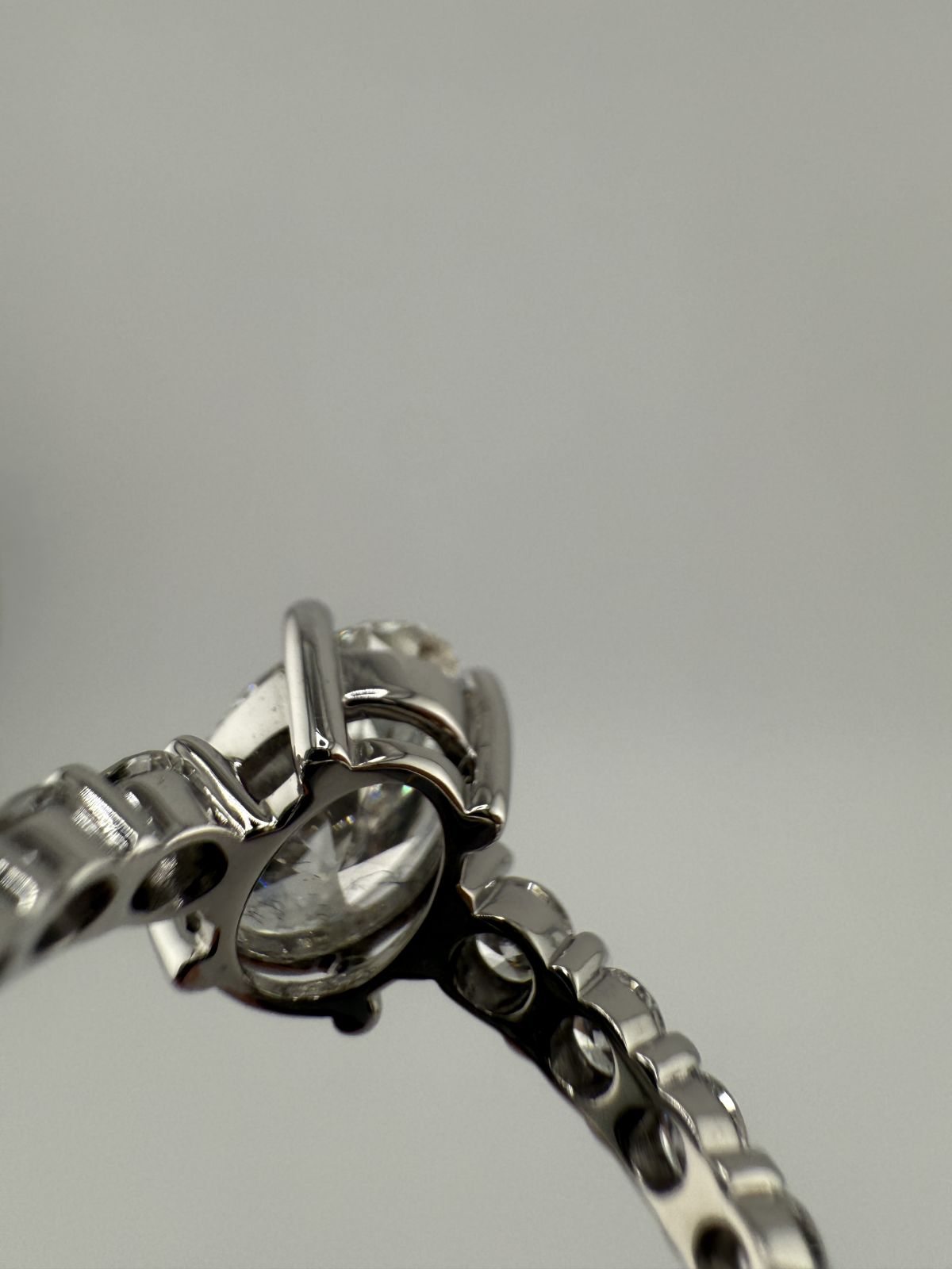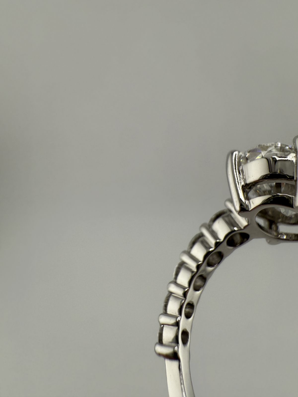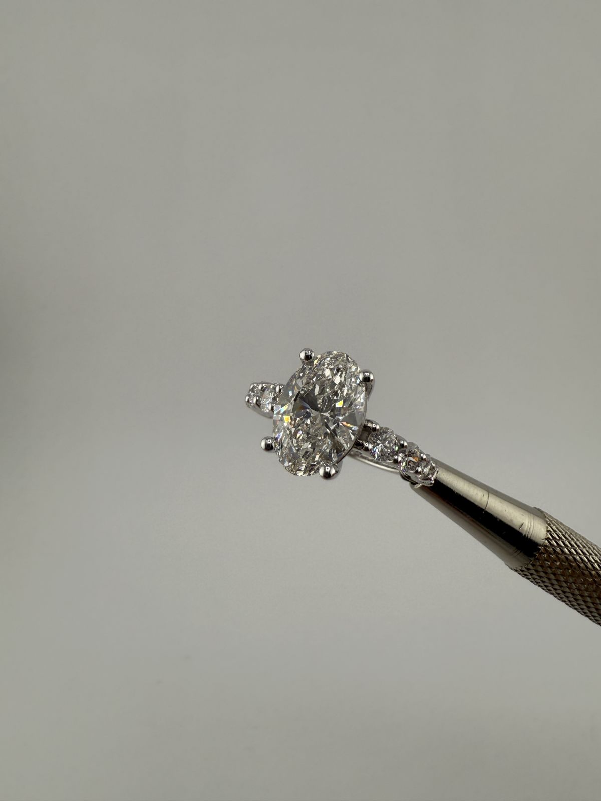 Grand Oval Pave to pierścionek z owalnym kamieniem centralnym, który podkreślają okrągłe kamienie ułożone po obu stronach szyny. Boczna gradacja kamieni od 3,0 mm przy kamieniu do 2,1 mm w najdalszym punkcie tworzy harmonijną linię i intensywny blask (łącznie 10 sztuk). Smukła, pave’owa oprawa elegancko wydłuża owal i nadaje całości nowoczesny, szlachetny charakter.