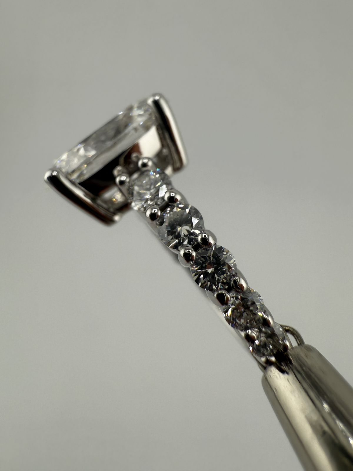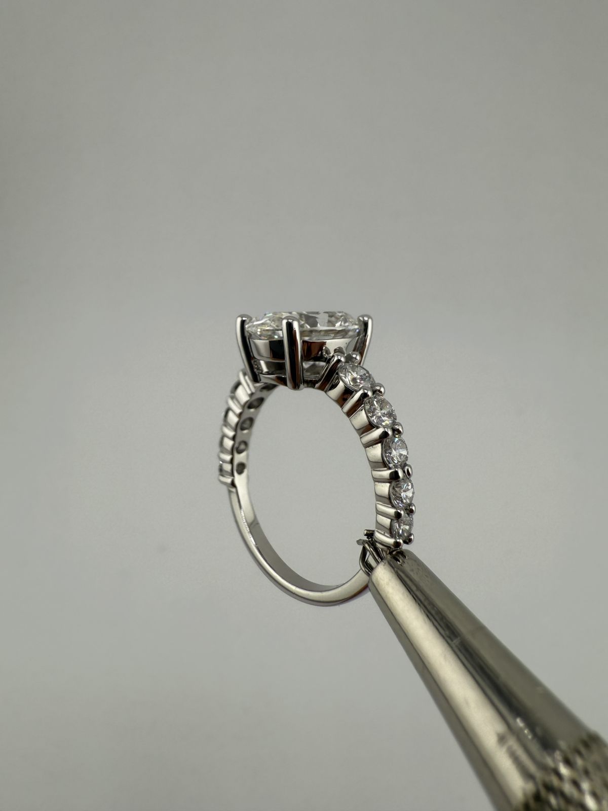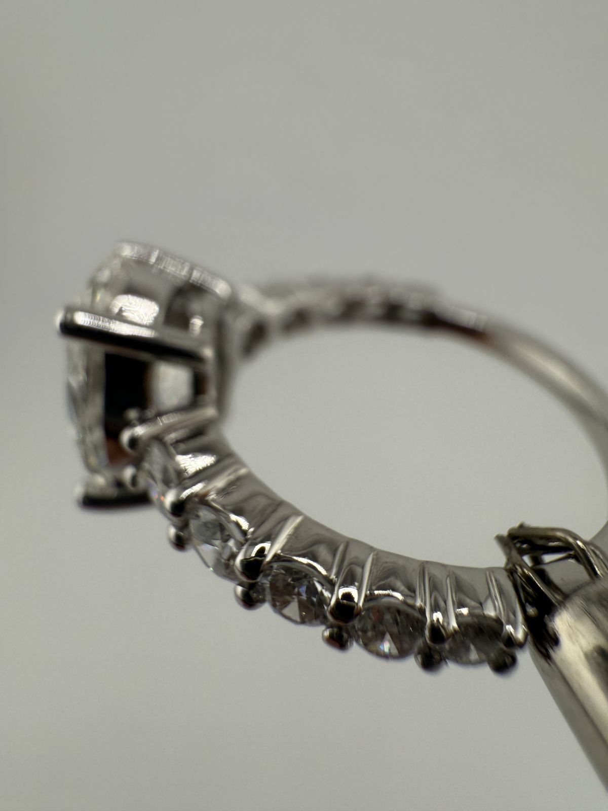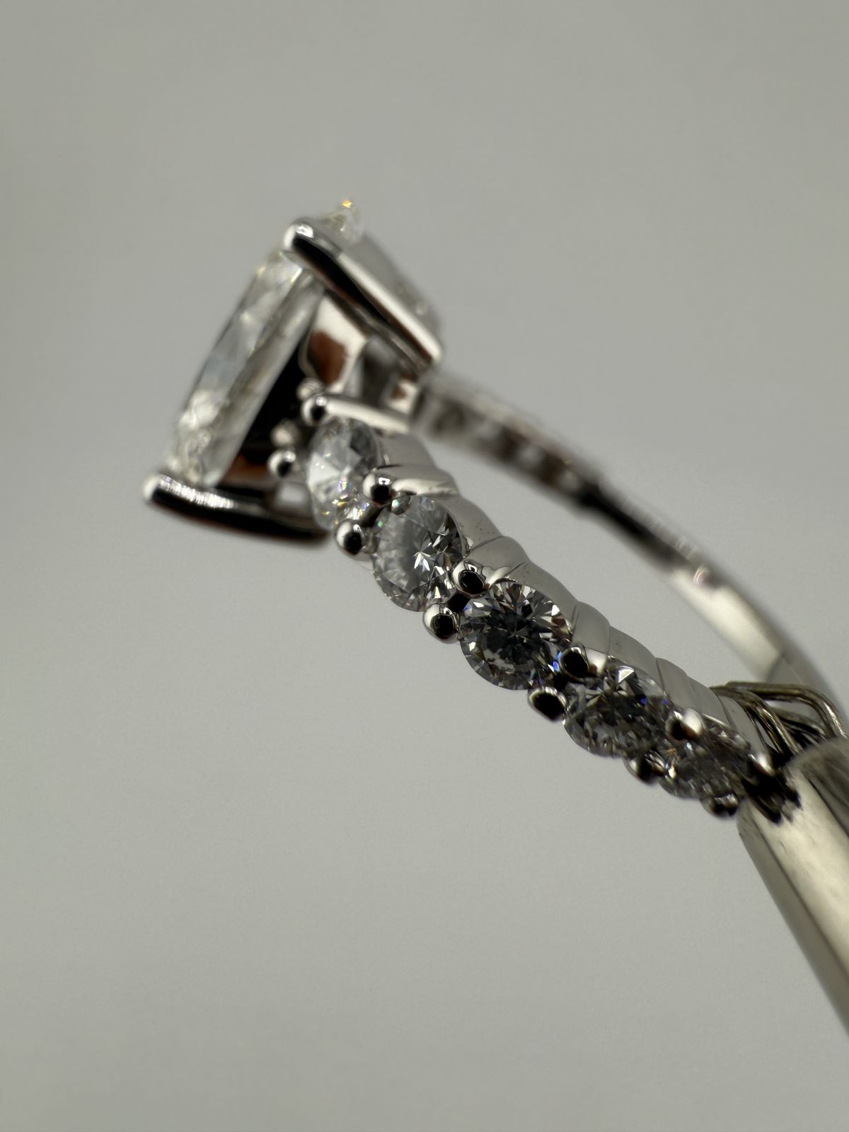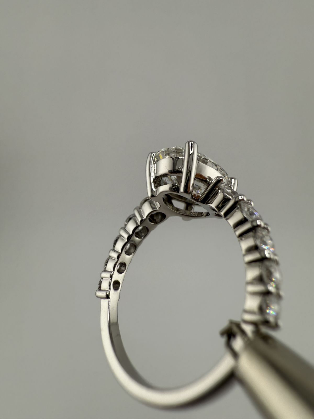 Grand Oval Pave to pierścionek z owalnym kamieniem centralnym, który podkreślają okrągłe kamienie ułożone po obu stronach szyny. Boczna gradacja kamieni od 3,0 mm przy kamieniu do 2,1 mm w najdalszym punkcie tworzy harmonijną linię i intensywny blask (łącznie 10 sztuk). Smukła, pave’owa oprawa elegancko wydłuża owal i nadaje całości nowoczesny, szlachetny charakter.